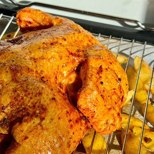 5. מכניסים את העוף ותפוחי האדמה לתנור שחומם מראש על 175 מעלות (ללא כיסוי) למשך שעה וחצי. מידי פעם תברישו בעזרת מברשת את העוף עם השומנים שהוא טפטף בתבנית עם תפוחי האדמה. בתיאבון!